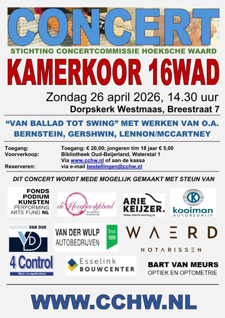 We zingen het op 26 april 2026 in Westmaas, als onderdeel van de concertserie die de Concertcommissie Hoeksche Waard hier al jaren organiseert. We verheugen ons op deze plaats tussen vele prominente ensembles. Kijk (klik hier) voor meer informatie en tickets op de site van de Concertcommissie.
